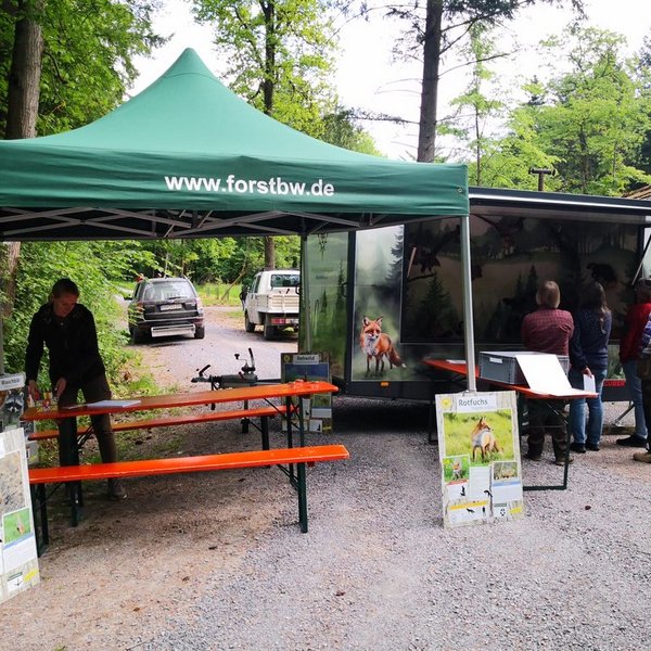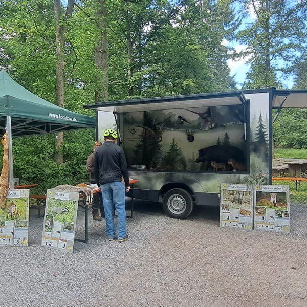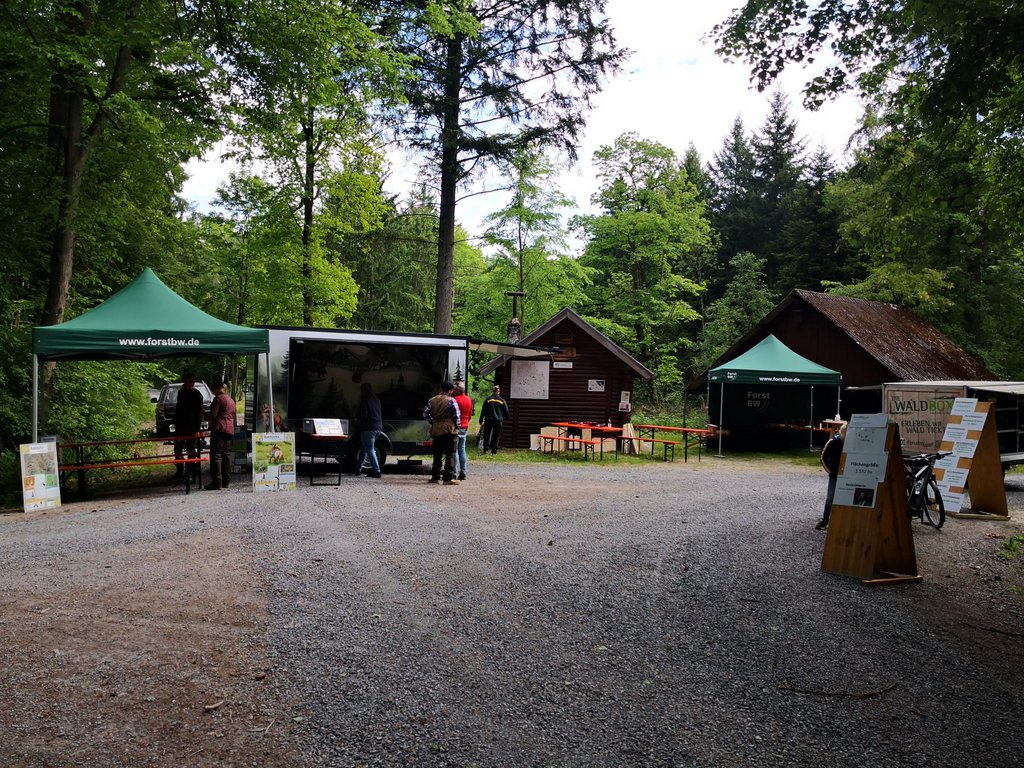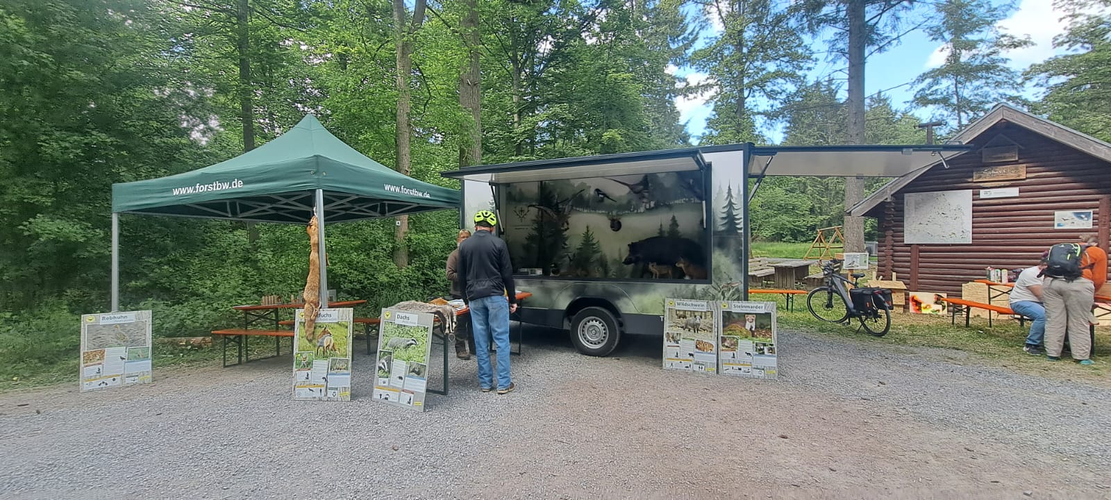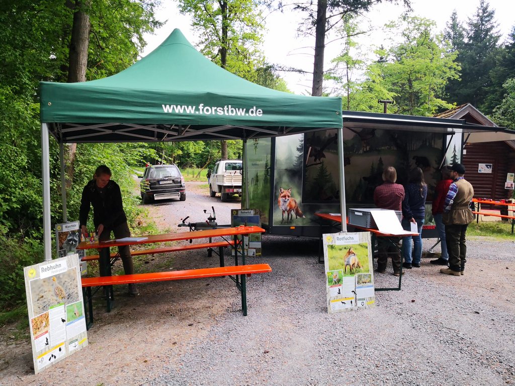 Die KJV beteiligte sich mit ihrem Lernort Natur-Anhänger an der “Heimat vor Ort”-Aktion, die entlang des Bierwanderweges durch Dörtel, Herbsthausen und Rot vorbeiführte. Viele Besucherinnen und Besucher zeigten sich im Nachgang begeistert von der Fülle der Erlebnis-Angebote und der kulinarischen Abwechslung, die entlang des Herbsthäuser Bierwanderweges geboten war. Der ohnehin reizvolle Bierwanderweg mit seinen Gewässern und Panoramen präsentierte sich bei strahlendem Frühlingswetter als besonders schöner Schauplatz des Geschehens. Hunderte Menschen waren hier den ganzen Tag über unterwegs und kamen beispielsweise auch im „Großen Kammerforst“ an der Hubertushütte vorbei. Hier informierte Revierleitern Carolin Aubele von Forst BW zusammen mit Vertretern der KJV, namentlich Claudia Albrecht, Lisa Wiebers und Michael Hachtel, Groß und Klein zu Wald und Wild.
